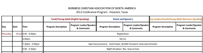 The attached file is the finalized program for the three sessions. Let me know if you have question or correction. Saya Maw San Awng, Youth Minister for the English speaking youths of Burmese Christian Fellowship Church, is filling-in for Dr. Mang on the Saturday, July 21 morning devotion.