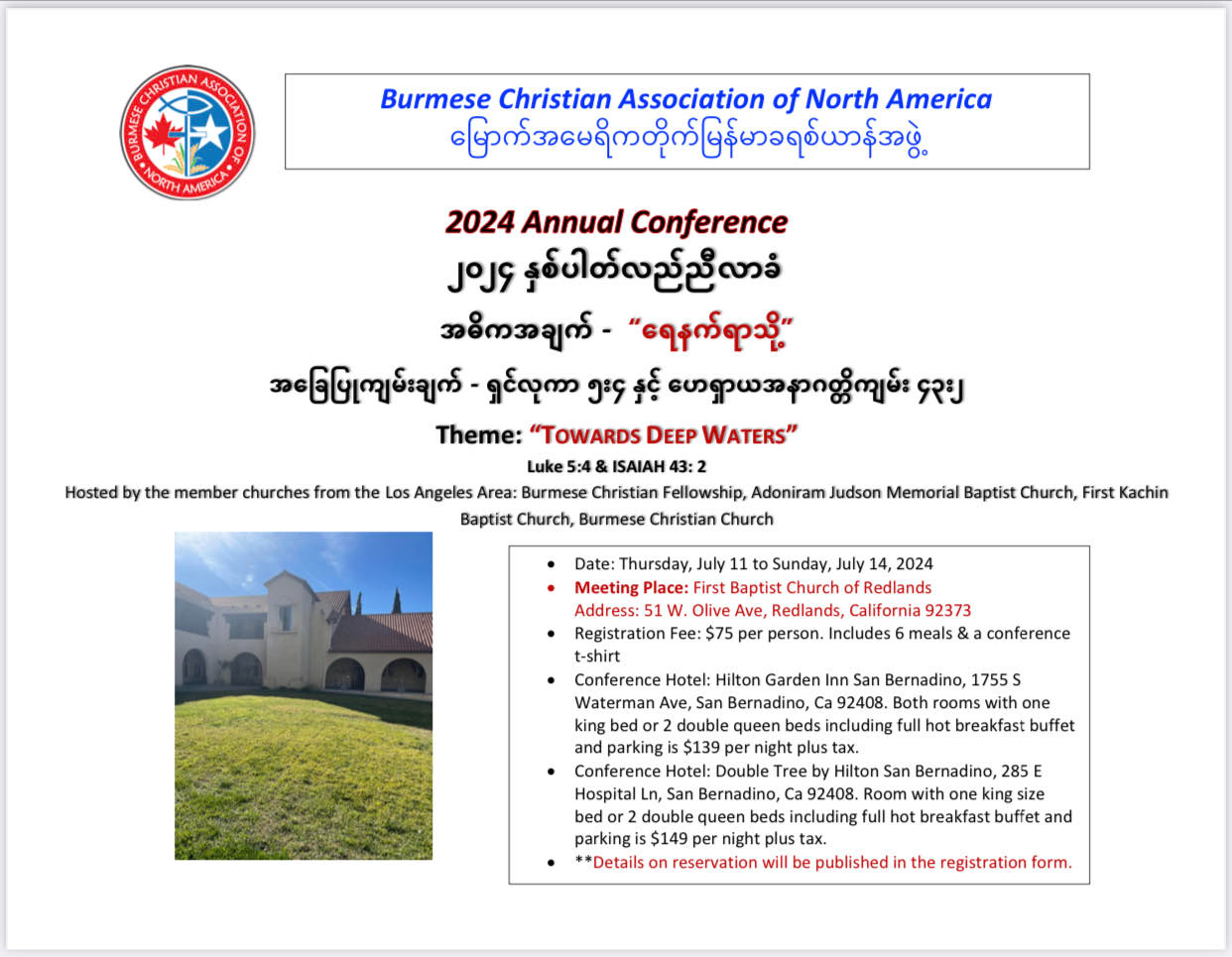 The Annual Burmese Christian Association of North America’s 2024 conference was set to hold in Los Angeles, California as follow. The main theme for this year is “TOWARDS DEEP WATERS ရေနက်ရာသို့ “ (Luke 5:4 & Isaiah 43:2).